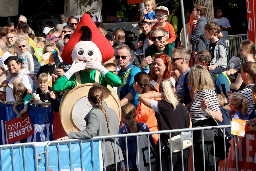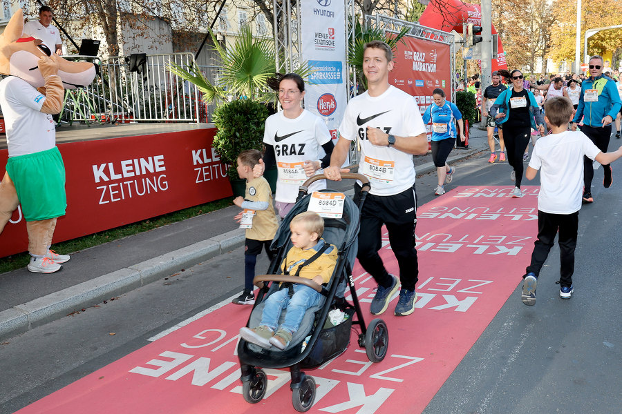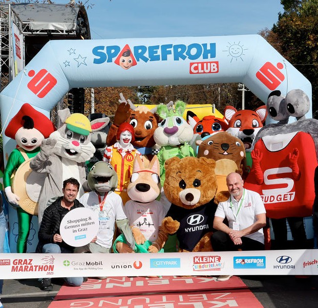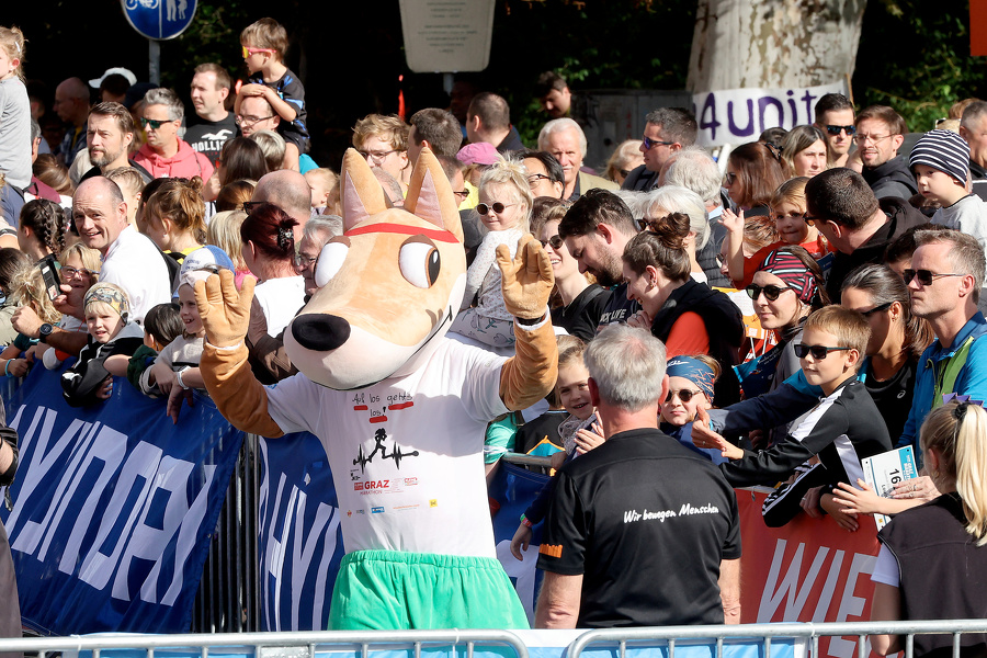 Den Auftakt machte um 14:15 Uhr der Kleine Kinderzeitung Maskottchenlauf, präsentiert vom CITYPARK. 20 Maskottchen, darunter Ferdi Flott (Graz Marathon), Sparefroh (Sparkasse), Parki (Citypark) und Hansi (Holding Graz), liefen die 60 Meter lange Strecke und wurden lautstark von den begeisterten Kindern angefeuert.